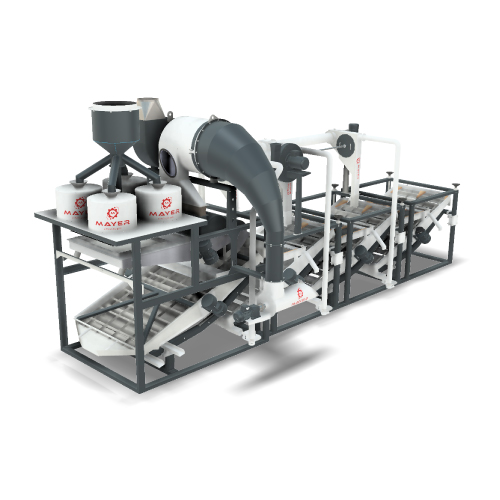 Çekirdek, elevatör ile 4 adet soyma değirmenine verilerek soyma işlemi yapılır. Değirmede soyulan çekirdek içi ve kabuk makine üzerinde bulunan hava emiş aspirasyon sistemi ile dışarı atılır. Çekirdek içi ve soyulmayan çekirdek makine üzerinde bulunan 4 adet vibro titreşimli elekler yardımıyla birbirinden ayrılarak finalde sadece çekirdek içi alınmış olur.